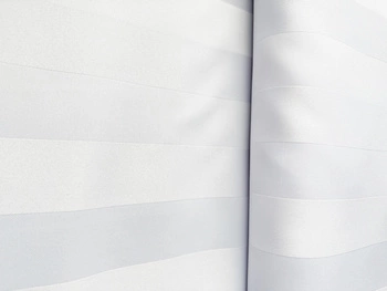 Tkanina plamoodporna biała w satynowe pasy o szerokości 5 cm.