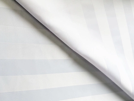 Tkanina plamoodporna biała w satynowe pasy o szerokości 5 cm.