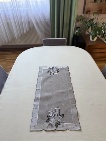 Odkryj piękno haftowanych detali! Bieżnik wykonany z trwałego materiału o subtelnym połysku, ozdobiony haftem w kolorach srebra i szarości. Idealny jako centralny element aranżacji stołu podczas Świąt Bożego Narodzenia. Tworzy przytulny, rodzinny klimat i podkreśla wyjątkowość chwili.