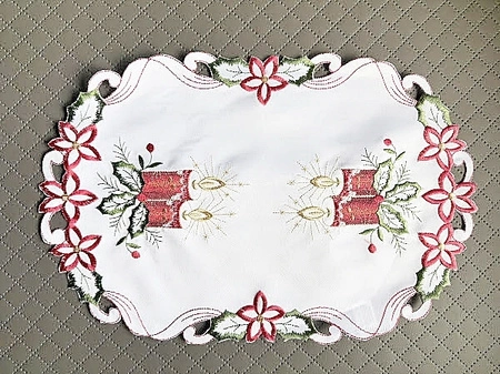 - Magiczny bieżnik na Święta Bożego Narodzenia! Wzór świec, subtelnych kwiatów i plamoodporny materiał. Serweta z haftowanym wykończeniem .