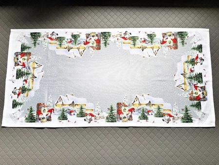 Wykonany z plamoodpornej tkaniny, doskonale chroni blat przed zabrudzeniami, a jednocześnie zdobi wnętrze motywem choinek, skrzatów i zimowych wzorów.