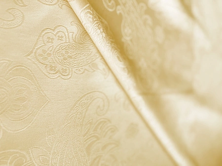 - Elegancka, plamoodporna tkanina obrusowa w kolorze beżowym z subtelnym wzorem żakardowym. Idealna na obrusy i dekoracje stołowe, łączy wytrzymałość z luksusowym wyglądem.