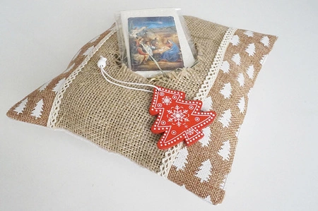 Zestaw opłatków wigilijnych z siankiem w poduszce jutowej plus ozdobna zawieszka na choinkę.