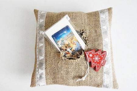 - Pachnące sianko w poduszce z juty i opłatki wigilijne w jednym zestawie. Wymiary 200×200 mm. Idealny na tradycyjną kolację wigilijną.