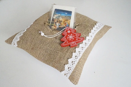 Zestaw opłatków wigilijnych z siankiem w poduszce jutowej plus ozdobna zawieszka na choinkę.